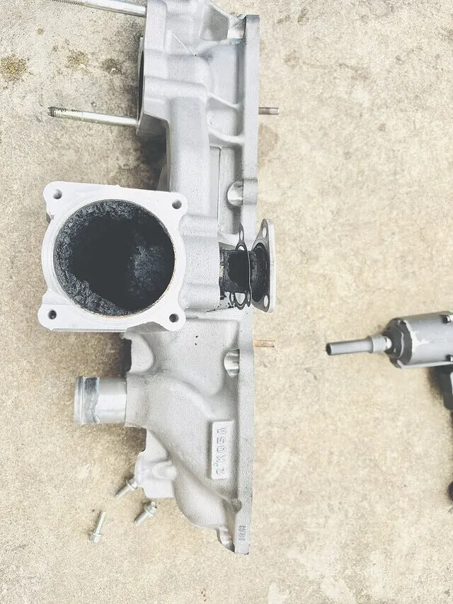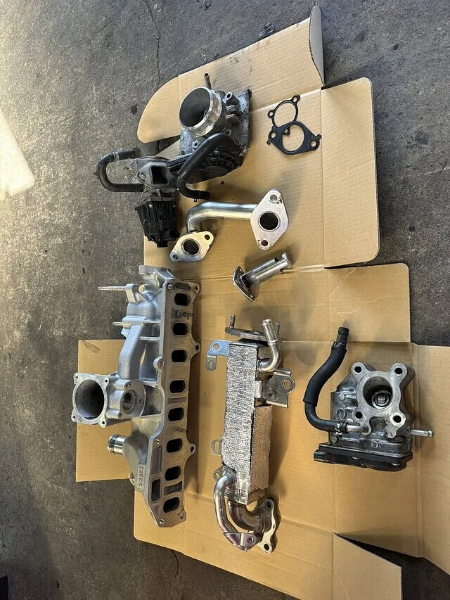 INマニホールド EGRバルブ シャッターバルブ、EGRクーラー他取り外し清掃煤やカーボンでコテコテでしたが何とか綺麗に洗浄して組付けマニホールド下のウォーターパイプも金属製の対策品に交換OK